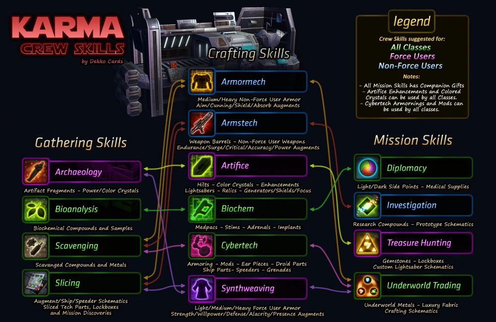 Ein wichtiger und entscheidender Unterschied zu bekannten MMOs liegt darin, dass in The Old Republic nicht der Charakter Fähigkeiten erwirbt, sondern das gesamte Team, also der Spielercharakter und seine Begleiter. Der Spieler wählt für sein Team drei Fähigkeiten, welche bis auf 600 Punkte ausgebaut werden können, von denen nur eine der drei eine Handwerksfähigkeit sein darf. Rollenspielerisch kann man das so erklären, dass auf dem Spielerschiff nur eine Werkstatt Platz findet. Aber ein Team kann durchaus drei Sammelfähigkeiten erlernen. Selbstredend sind bestimmte Kombinationen sinnvoller als andere. Im folgenden Bild ist veranschaulicht, welche Fähigkeiten zusammenpassen.