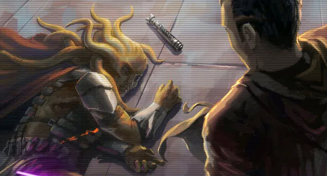 Barel Ovair en Eison Gynt vechten tegen de Massassi op Yavin 4 tijdens hun missie.