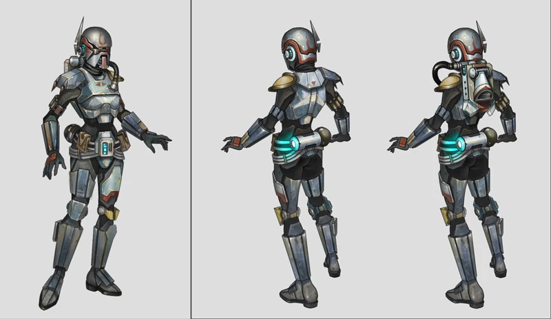 Preparation is the Bounty Hunter's best defense, and cutting-edge protective gear is standard equipment for most Bounty Hunters. Artisans spend months and even years hand-crafting the Bounty Hunters' heavy armor to ensure it offers superior resistance to all manner of weaponry, and that each suit will still allow maximum flexibility and versatility. Offense is just as critical as defense, however, and powerful weaponry is necessary for any Bounty Hunter who might have to shoot his way out of a messy situation. It's not unheard of for a Bounty Hunter to spend as many credits on an advanced blaster as others might spend to purchase an entire starship.
